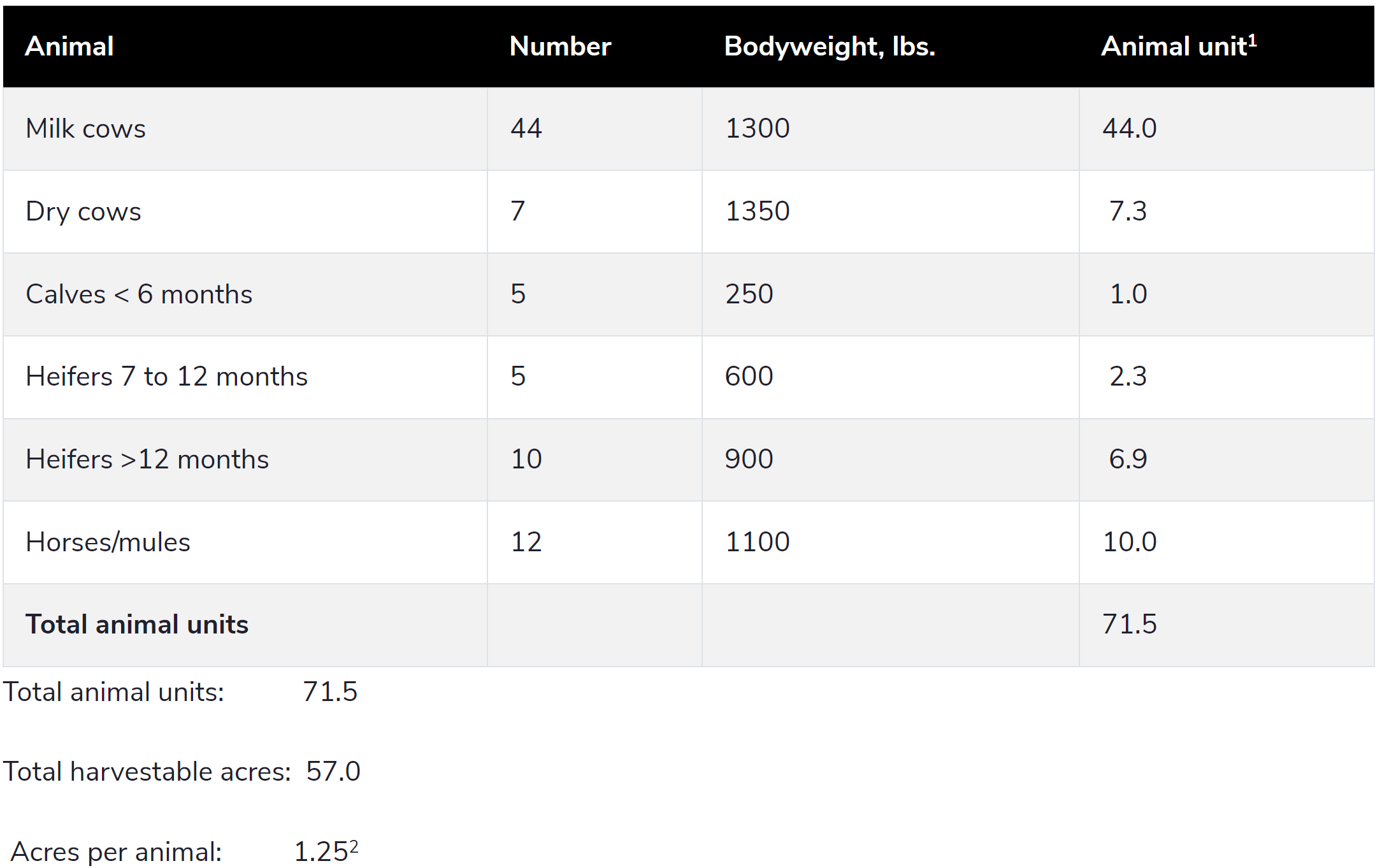 1The milking herd average bodyweight is considered the standard bodyweight of 1.0. Example: dry cow bodyweight of 1350 divided by 1300 equals 1.038 times 7 dry cows equals 7.3 animal units.