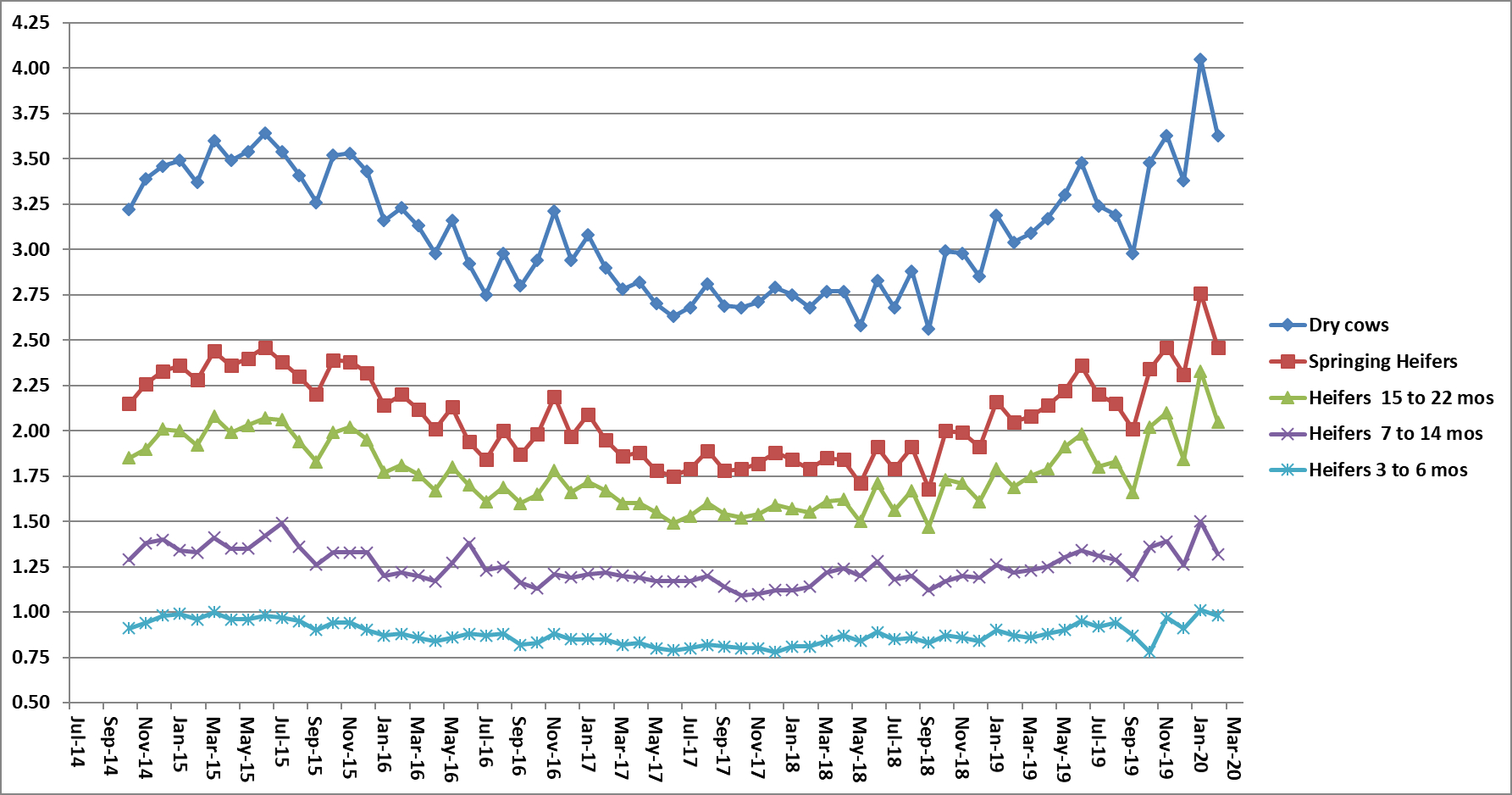 Starting with July 2014's milk price, income over feed cost was calculated using average intake and production for the last six years from the Penn State dairy herd. The ration contained 63% forage consisting of corn silage, haylage and hay. The concentrate portion included corn grain, candy meal, sugar, canola meal, roasted soybeans, Optigen and a mineral vitamin mix. All market prices were used.