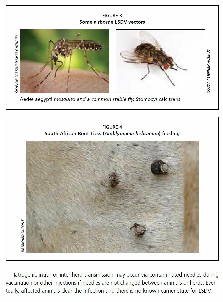 The first case of LSD can often be traced to the legal or illegal transfer of cattle between farms, regions or even countries. In fact, movements of cattle may allow the virus to jump over long distances. Short-distance leaps, equivalent to how far insects can fly (usually < 50 km), are occasioned by numerous local blood-feeding insect vectors feeding on cattle and changing hosts frequently between feeds. No evidence exists of multiplication of the virus in vectors, but it cannot be excluded. The principal vector is likely to vary between geographical regions and ecosystems. The common stable fly (Stomoxys calcitrans), the Aedes aegypti mosquito, and some African tick species of the Rhipicephalus and Amblyomma spp., have demonstrated ability to spread the LSDV. Viral transmission from infected carcasses to naïve live animals via insects is a possible risk, but has not been sufficiently studied.