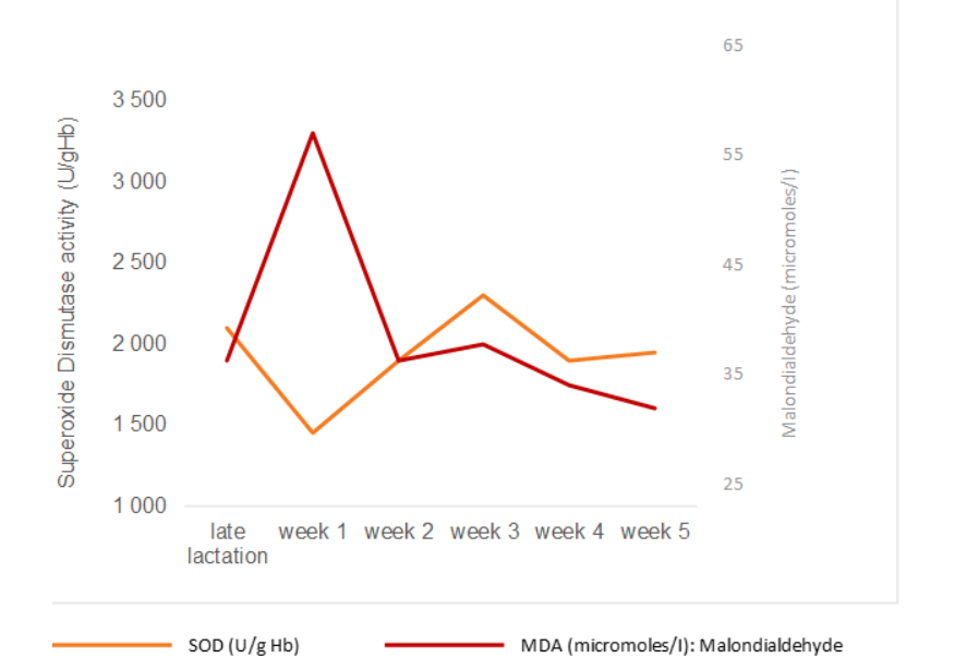 Research supports this phenomenon. A study by Adela et al. (2006) showed that level of Super-Oxide Dismutase (SOD), a primary antioxidant enzyme, is decreasing after calving, and will only return to baseline three weeks after calving. On the other hand, the level of oxidized compounds (free radical) such as Malondialdehyse (MDA), increase (Figure 1).