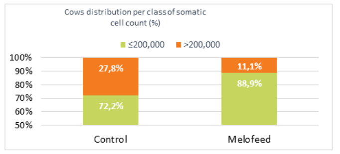 Figure 2: Effect of MELOFEED supplementation on cows distribution per class of SCC (Lallemand Animal Nutrition internal data. 2020. Commercial farm, Germany).