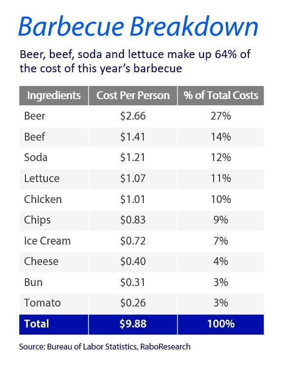 - In 2024, hosting a 10-person barbecue on the Fourth of July will cost $99, the highest on record. This year, beer, beef, soda and lettuce make up 64% of the total cost.