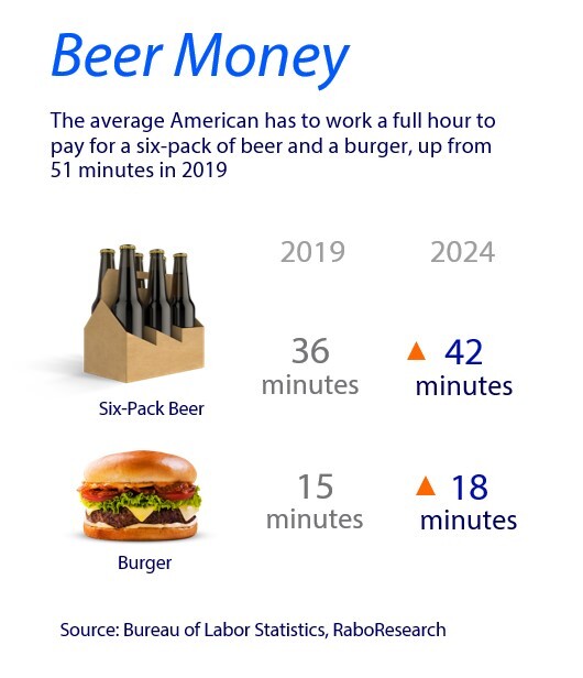Indeed, while the overall pace of inflation has moderated to more normal levels since last summer, prices are still moving higher. The 2024 Rabobank BBQ Index, which measures the cost of staple ingredients for a 10-person barbecue, shows that it will cost $99 to host a cookout on the Fourth of July this year, up from $97 last year and $73 in 2018. This year, beer, beef, soda and lettuce account for a hefty 64% of total barbecue cost.
