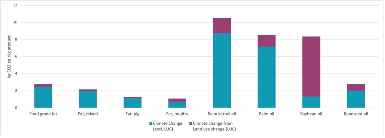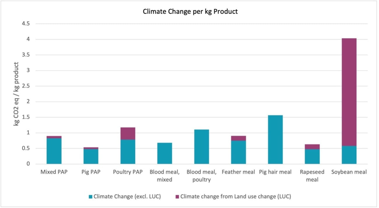 Soybean, palm and rapeseed, the vegetable-based alternatives to animal-based proteins and fats, have a higher overall carbon footprint than the ABP derived products. See Figures 2 and 3 which show the climate change impact per kg for ABP derived products and vegetable alternatives including land use change.