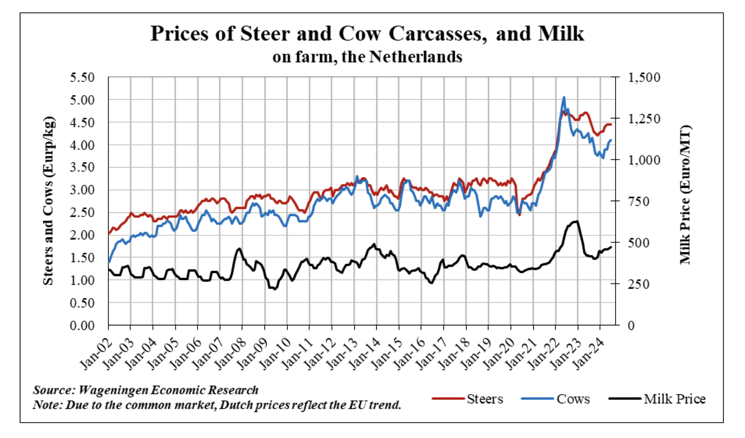 The milk price peaked in 2022 (see graph below), dropped in 2023, after which it only partially recovered this year. At the same time, is the sector in Western Europe facing multiple production limiting factors related to restrictive environmental regulations and disease outbreaks (for more information see Dairy and Products Semi-annual, published on May 22, 2024).