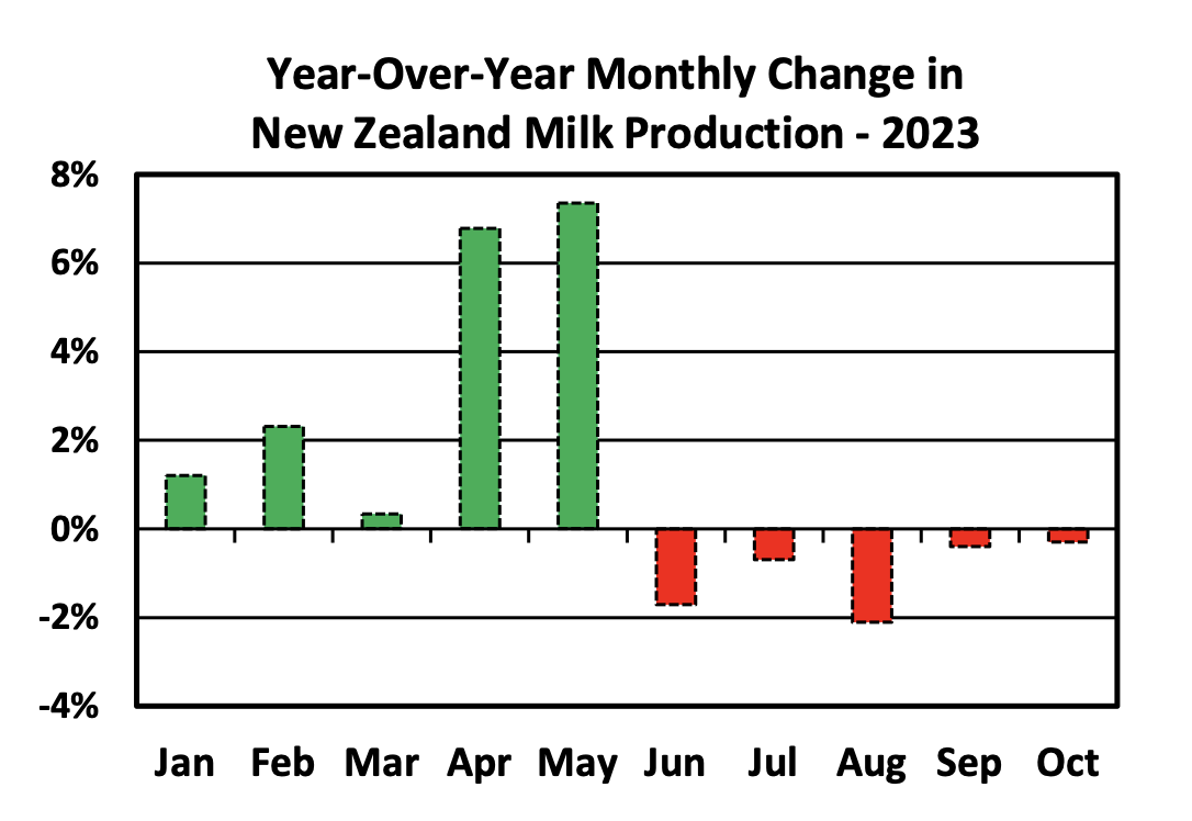 Factors most prominently contributing to this outlook include the impact of El Niño weather patterns, a reduction in farmgate milk prices, persistent on-farm inflation, and a shrinking dairy herd. New Zealand's pastoral-based production system heavily relies on adequate levels of rainfall to build feed reserves for spring. Forecast dry conditions during the summer months (December-February), according to the most recent seasonal climate outlook released by the National Institute of Water and Atmospheric Research, are expected to hamper pasture growth and the accumulation of feed reserves, particularly in the North Island, which constitutes 57% of the dairy herd.