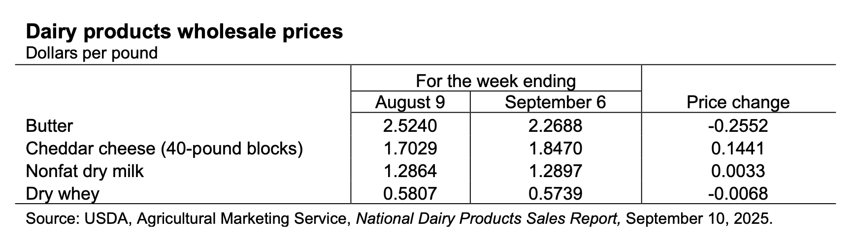 For the biweekly period from September 1 to September 12, the average export prices per pound for selected dairy products—based on price ranges reported by Dairy Market News (DMN)—showed mixed movements across Oceania and Europe, with variations by product category compared to the previous biweekly report. Butter prices declined, with Europe averaging $3.46 (down 22 cents) and Oceania at $3.21 (down 5 cents). Skim milk powder (SMP) also saw decreases, with Europe at $1.22 (down 4 cents) and Oceania at $1.21 (down 9 cents). In contrast, dry whey from Europe rose to $0.56 (up 4 cents), while Oceania Cheddar climbed to $2.15 (up 7 cents), reflecting stronger demand in the cheese segment.