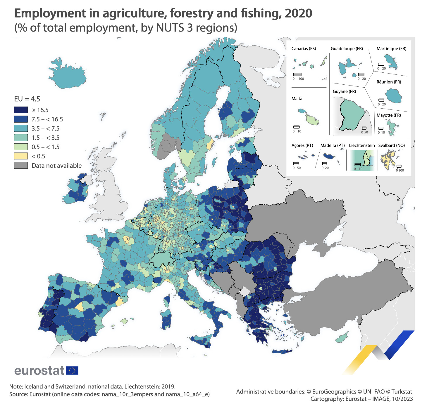 Toward the lower end of the range, 137 regions in 2020 had less than 0.5% of their workforce employed in agriculture, forestry, and fishing.